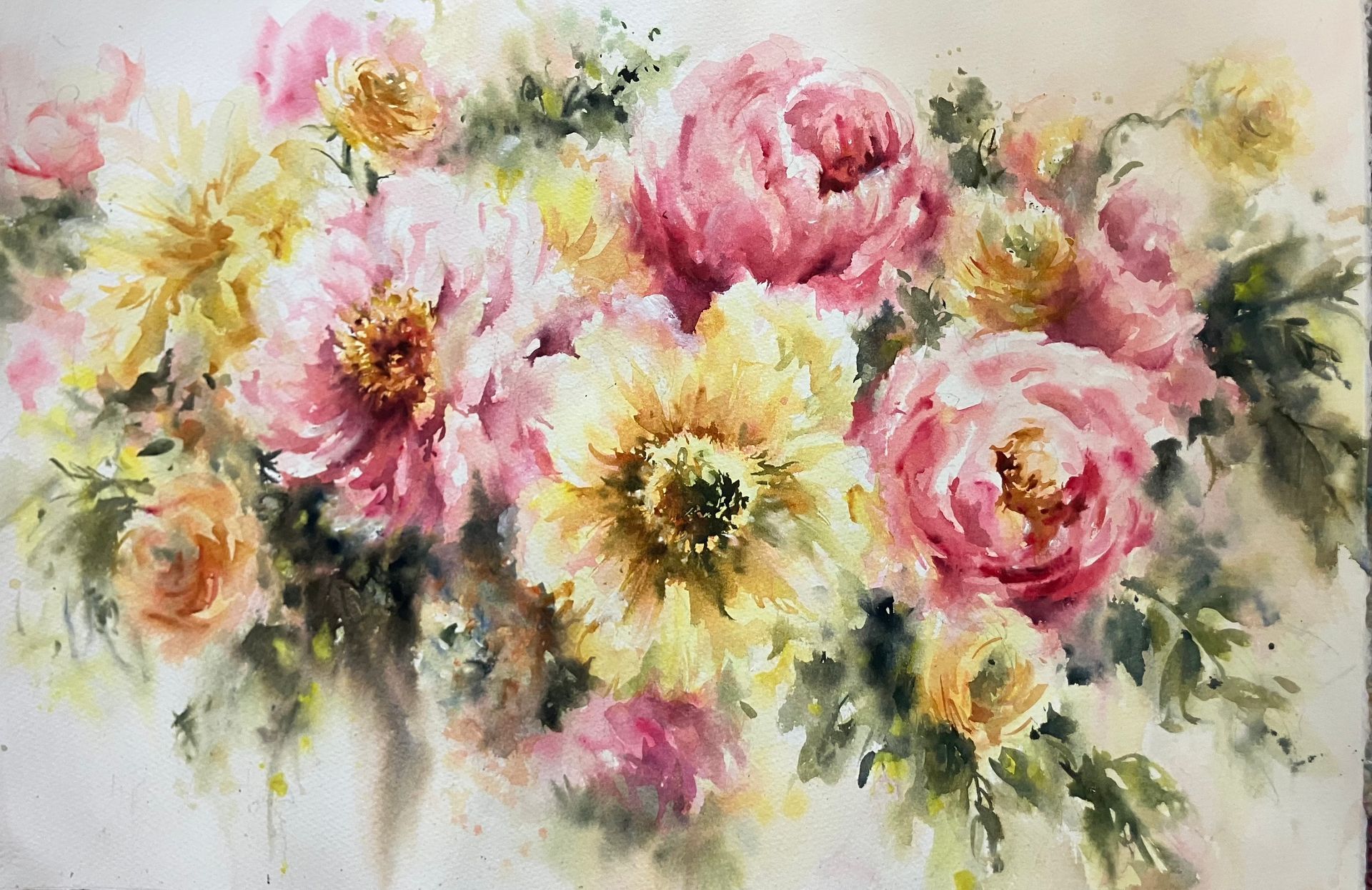 As a complete beginner 2 years ago she allowed me to develop my own style and led me in bite sized chunks with sound direction when needed and with more experienced water colour painters she encourages them to experiment even more.”